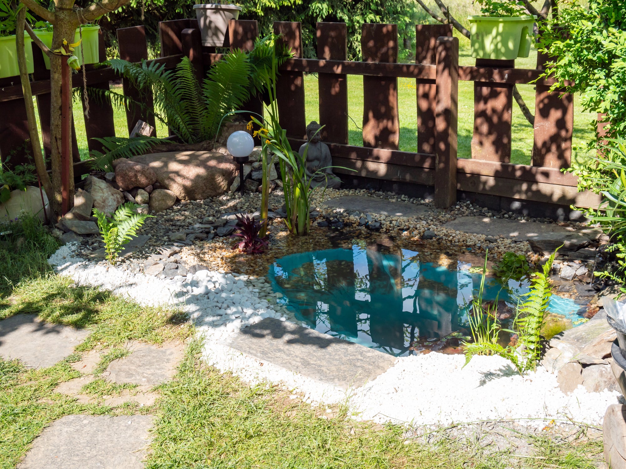 Ein Mini-Teich sollte nicht den ganzen Tag in der prallen Sonne stehen, da sonst zu starkes Algenwachstum gefördert wird. Optimal ist ein Platz mit Morgen- oder Abendsonne.