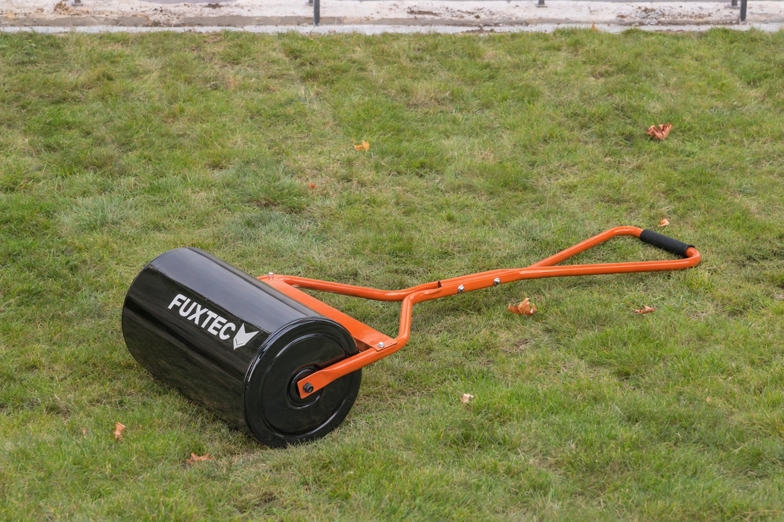 Eine mit Wasser gefüllte Rasenwalze drückt den Boden vorsichtig nach unten. Ziel ist nicht, den Boden stark zu verdichten, sondern nur kleine Höhenunterschiede auszugleichen.