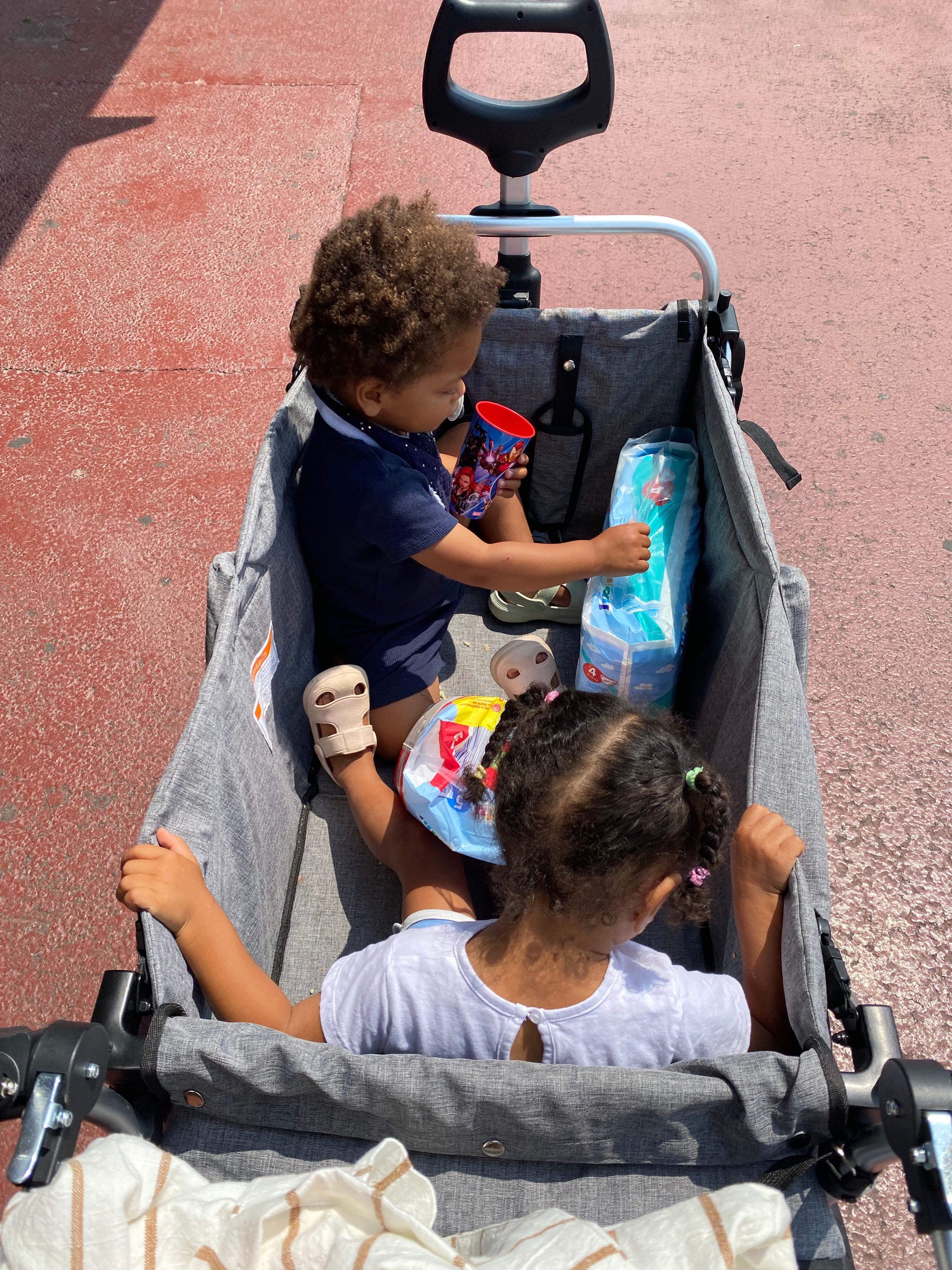 Kein herkömmlicher Bollerwagen wie jeder andere, sondern vom TÜV Süd explizit zur Beförderung von Kindern zertifiziert.