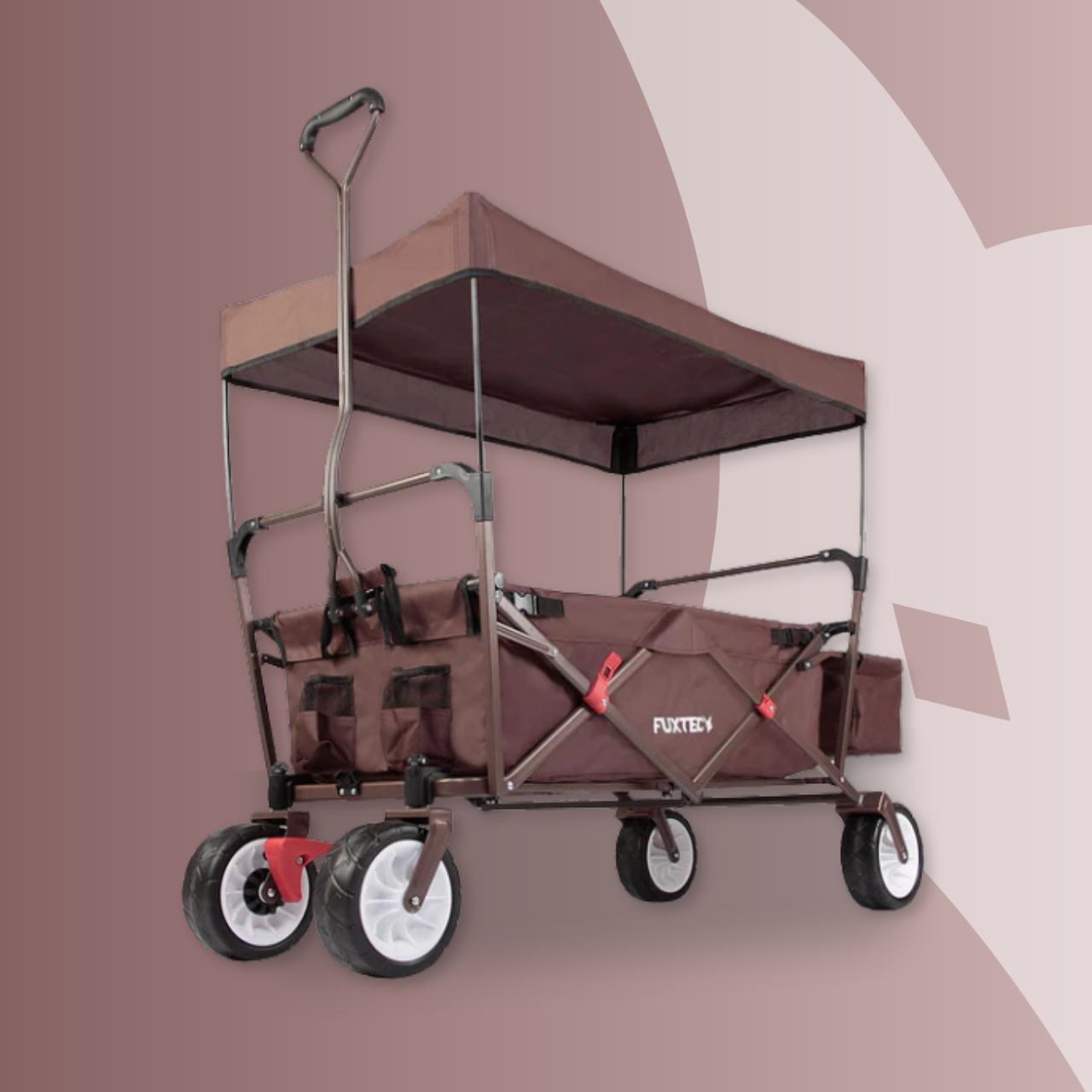 Der Bollerwagen FX-CT350 überzeugt mit seinen breiten Reifen, dem kompakten Faltmaß von nur 18 cm Tiefe und dem praktischen Sonnen-/Regendach – ein robuster Allrounder für Strand, Garten oder Alltag.
