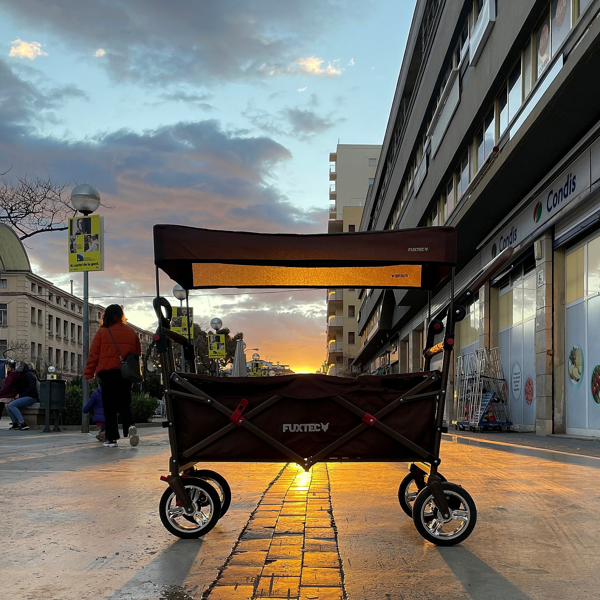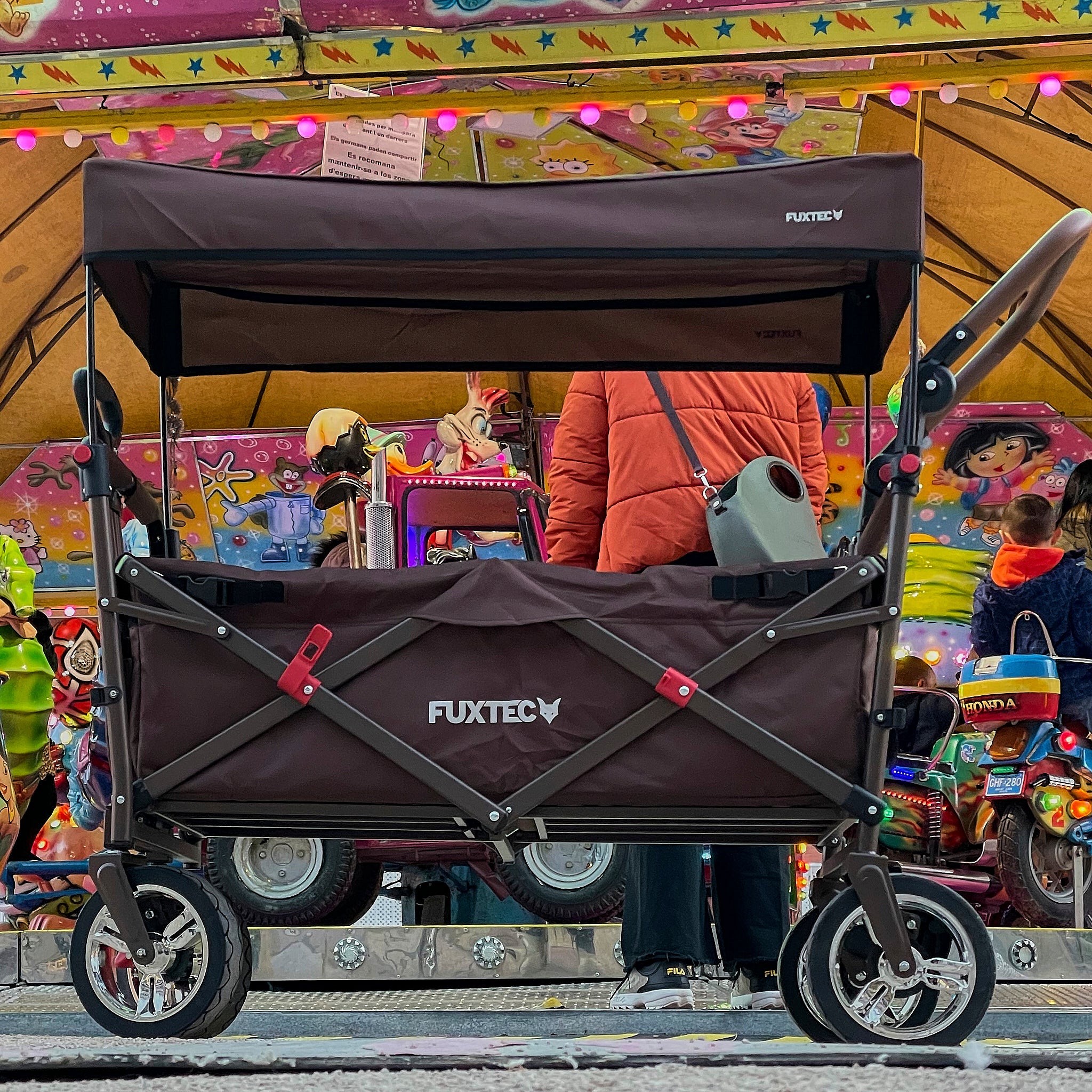 De bolderkar FX-CT700 biedt comfort en bescherming dankzij het UV-beschermde zonnedak en de extra duwbeugel – ideaal voor wie onderweg slim en eenvoudig wil vervoeren.